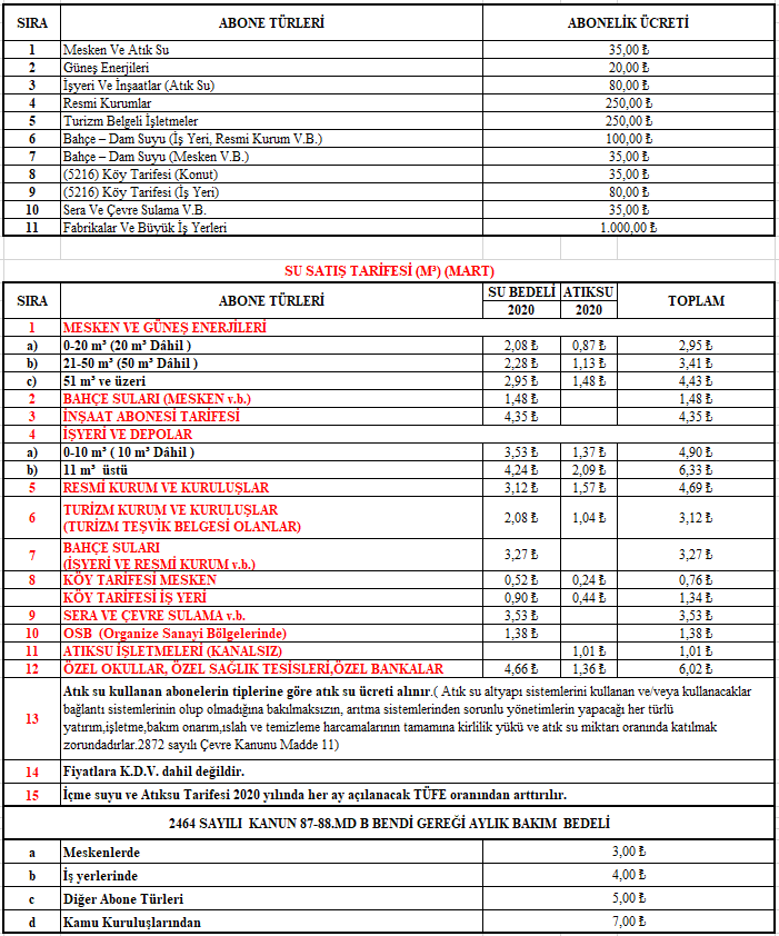 2020 Yili Su Satis Tarifesi Sanliurfa Su Ve Kanalizasyon Idaresi Genel Mudurlugu